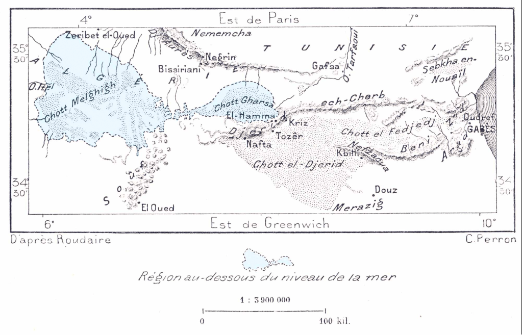 Versions of Robinson’s geoengineering scheme to flood the endorheic valleys have persisted in the xerophobic colonial imaginary for at least 150 years. In 1874 the French military official François Élie Roudaire published an article titled “An Inland Sea in Algeria.” He proposed constructing a canal from Tunisia’s Gulf of Gabes to the Chott Melrhir in Algeria.