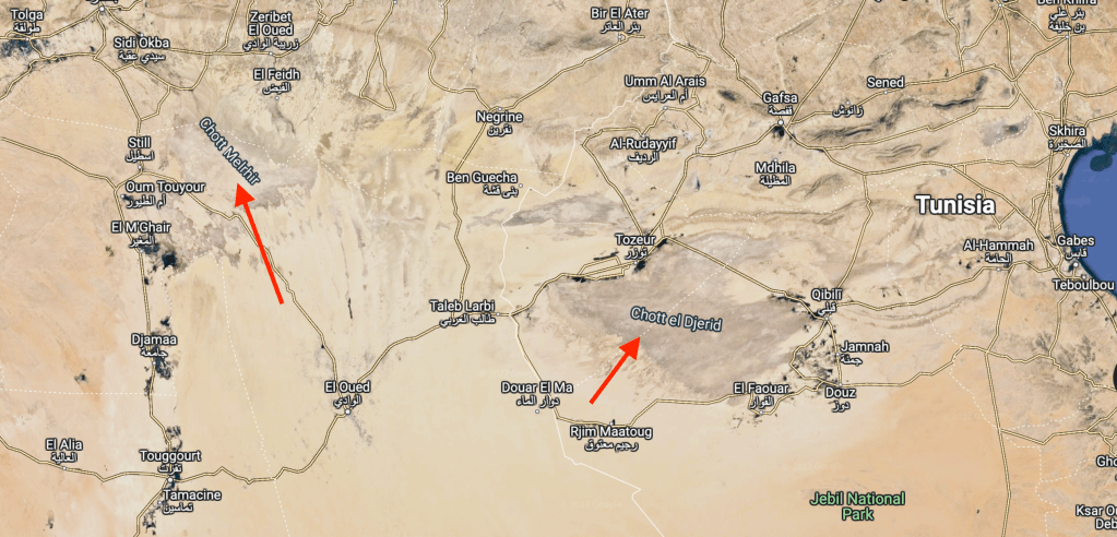 Chott el Djerid and Chott Mehlrir regions of Tunisia and Algeria, inland from the Gulf of Gabes.