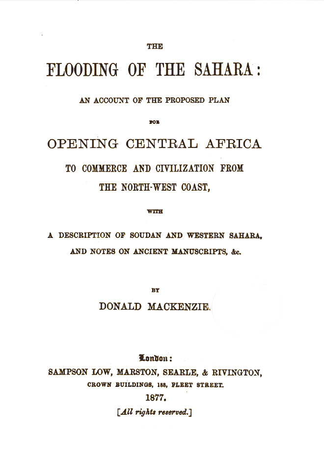 A few years later, in 1877, Donald Mackenzie, a professor at the University of Edinburgh, proposed a similar scheme. He outlined the proposal in a book titled The Flooding of the Sahara, with the imposing colonialist subtitle, An Account of the Proposed Plan for Opening Central Africa to Commerce and Civilization from the North-west Coast, with a Description of Soudan and Western Sahara, and Notes of Ancient Manuscripts, &c.