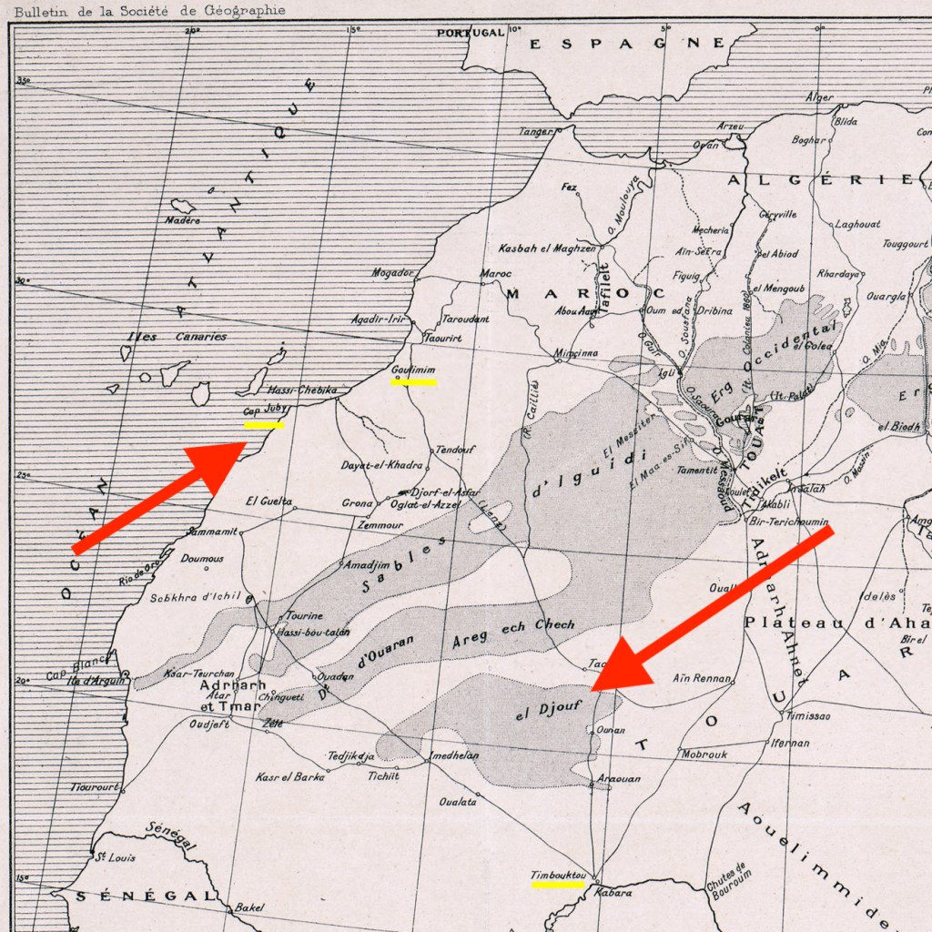 Mackenzie proposed to flood the basins of the Sahara via channels directing Atlantic ocean waters from Morocco’s Cape Juby region into the El Djouf basin on the present border of Mauritania and Mali. Like Roudaire’s proposal, Mackenzie’s plan was never put into effect. However Jules Verne envisioned a similar scenario in his final novel, Invasion of the Sea, published in 1905. In that novel, the engineering project fails, but, ironically, a massive earthquake opens a channel that accomplishes the same end.